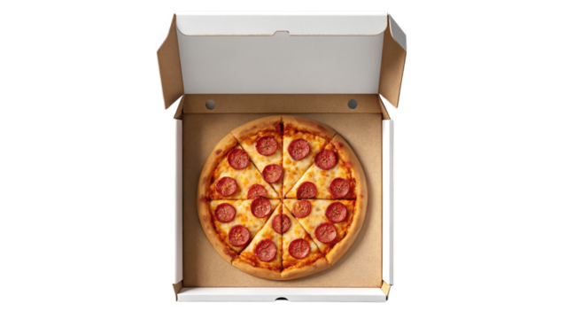 Pepperoni pizza in a box delivery takeout food italian cuisine fast food restaurant meal dinner lunch 10 inch on transparent background