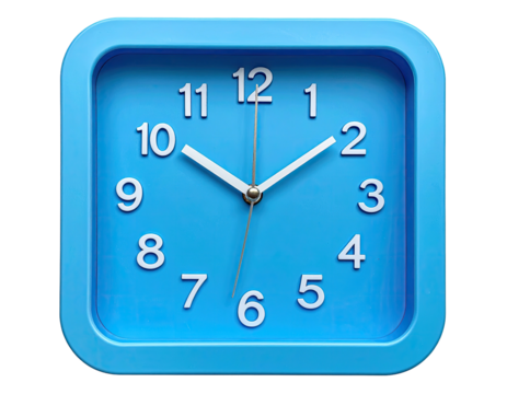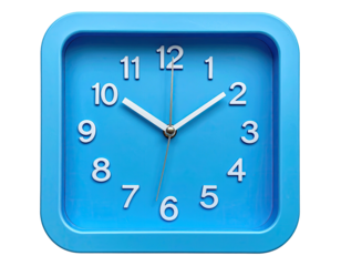 Close-up of a square, bright blue analog clock face