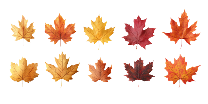 Ten colorful autumn leaves showing changing seasons on transparent background