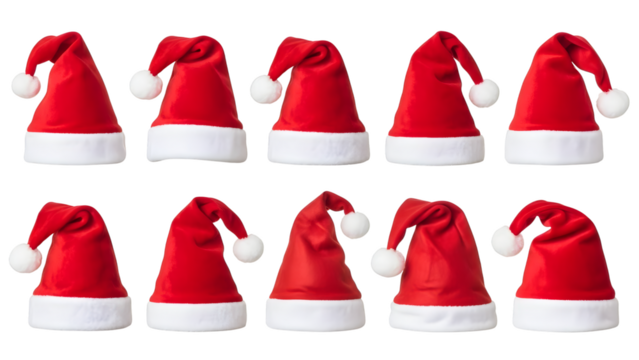 Ten Red Santa Hats With White Pompoms Isolated On Black
