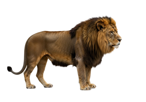 Side view of a Lion walking, looking at the camera, Panthera Leo, 10 years old, isolated on a white transparent background