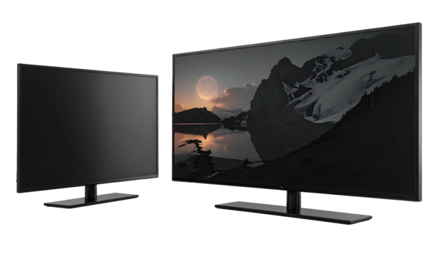 Two monitors; one with landscape, other blank, on black ground