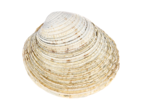 PNG cut out isolated background. A pile of fresh clams with striped, textured shells, with one open clam revealing its tender, glossy interior.