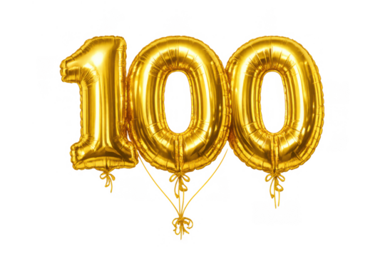 Number 100 gold foil balloons for a hundred year anniversary celebration, birthday, or special hundredth event, transparent background
