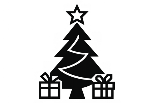 Christmas tree silhouette symbol with star and gifts, celebrating winter holidays and festive season, transparent background