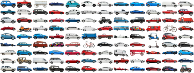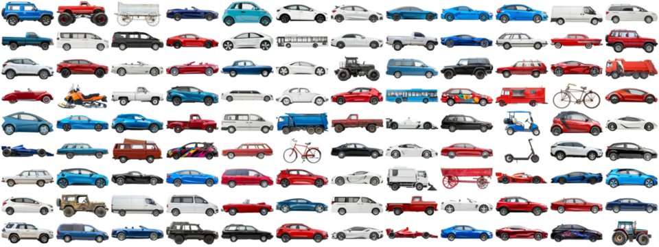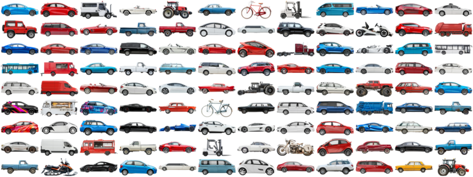 108 cars and various vehicles set of sedan, sports car, super car, bus, electric car, race car and other motor vehicles, many car photo collection set on isolated background AIG44