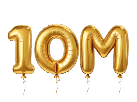 1M numbers made with golden foil balloon, isolated on transparent background, can be used for socail media celebrations, youtube subscribers, Instagram followers, facebook likes/followers. Web Social