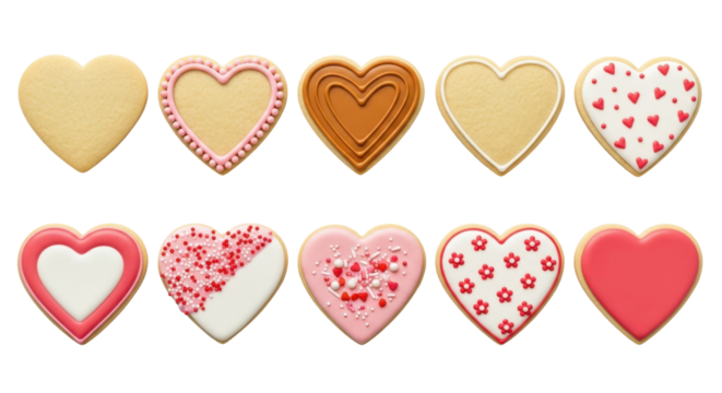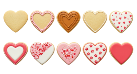 Collection of ten heart-shaped cookies with various decorations for Valentine's Day