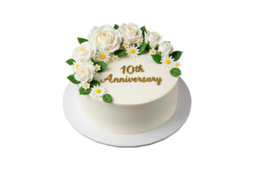 10th Anniversary white cake with roses and daisies isolated on transparent background