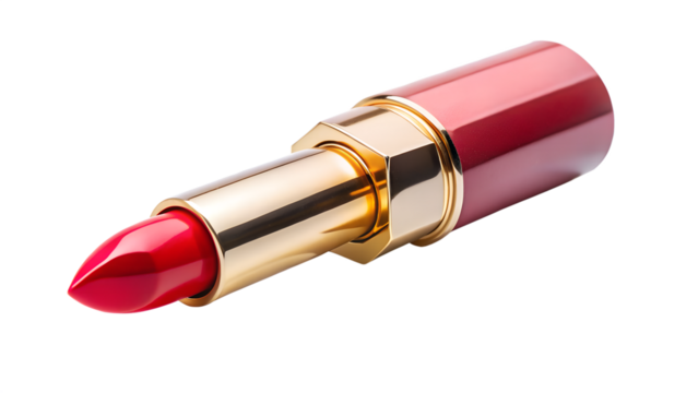 Red lipstick in a golden tube isolated on transparent background for a beauty and fashion concept around 110 characters