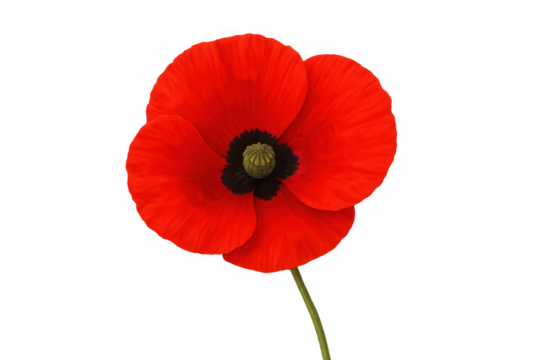 Vibrant red poppy blossom highlighting delicate petals against transparent backdrop, symbolizing memorial remembrance and peace
