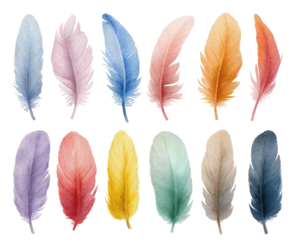 Collection of twelve fluffy feathers, various colors, isolated on a solid black background