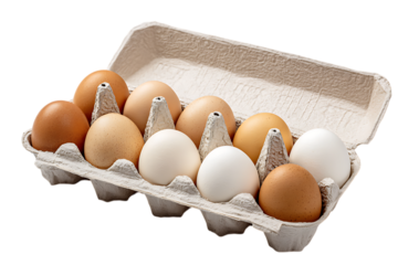 Ten brown and white eggs in carton isolated on transparent background