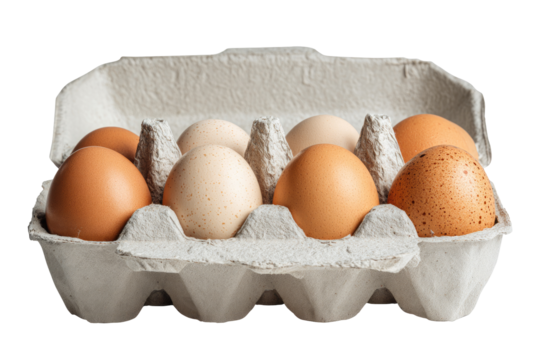 A carton of various-colored eggs.  The carton is light gray, made of recycled paper, and holds a dozen eggs.  The eggs range in color from light brown to tan and cream