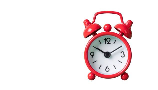 Red twin bell alarm clock with black hands and white face showing twelve oclock on a plain background alpha channel with white background