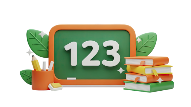 3D Render of Classroom Elements: Numbers, Books, and Supplies