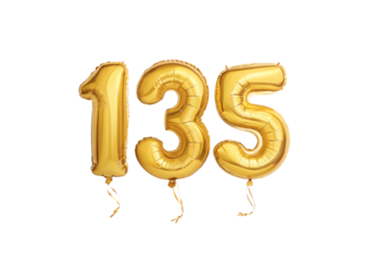 135 Number Shiny Gold Balloon, Celebratory Foil Balloon Decoration. isolated on transparent background, Helium balloons font.