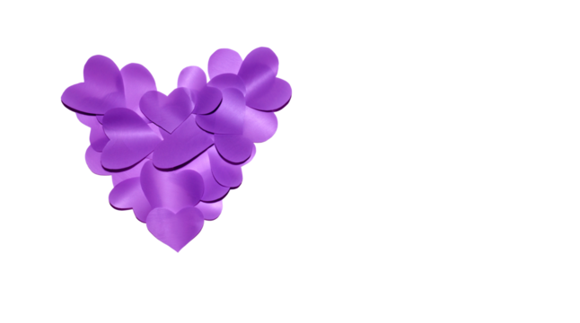 Purple hearts made of paper, isolated, top view. Valentine's day concept. Copy space for text. Birthday, mothers day, 8 march, 14 february greeting card design.