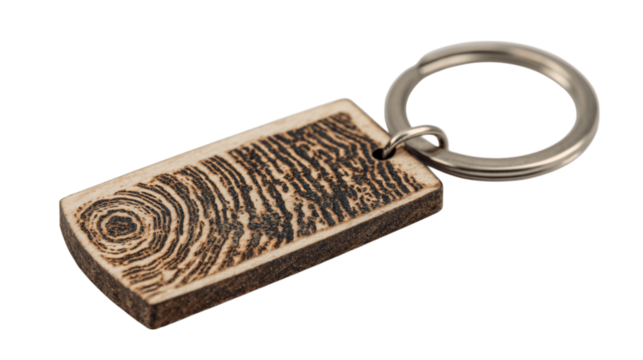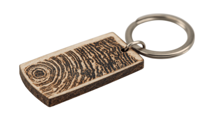 A etched wood key tag with ring variant 1439, white background --ar 16:9