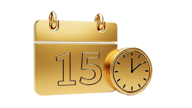 Yellow and black stopwatch showing 15 minute isolated on transparent background
