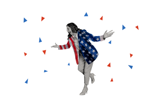 Creative poster collage banner of dancing aged woman celebrate independence day on pastel color background