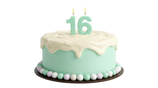 Mint Green 16th Birthday Cake with White Icing and Lit Candles