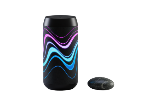 Obsidian black wireless speaker with purple-blue liquid light display, polished river stone, pristine transparent studio background, soft lighting, technological elegance