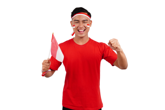 Excited young Asian men with Indonesian flags to celebrate Indonesian independence day on 17 August isolated on transparent background