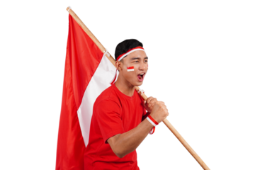 Indonesian man celebrating Indonesia's independence day on 17 August by holding the Indonesian flag isolated transparent