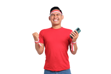Excited young Asian man celebrate Indonesian independence day on 17 August while holding mobile phone isolated on transparent background