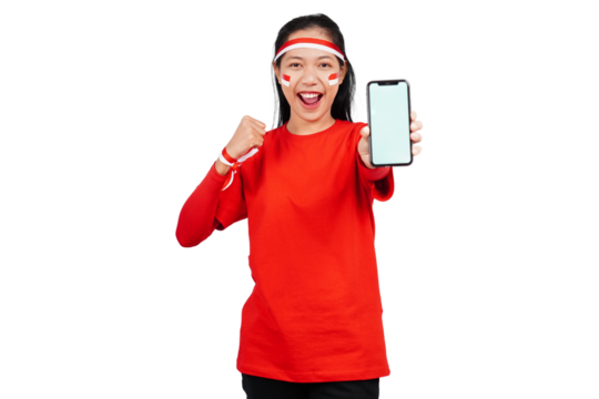 An Indonesian woman celebrating Indonesia's independence day on 17 August while holding smartphone with blank screen isolated transparent