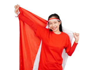 Indonesian woman celebrating Indonesia's independence day on 17 August by holding the Indonesian flag isolated transparent