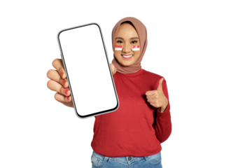 An Indonesian woman celebrating Indonesia's independence day on 17 August while holding smartphone with blank screen isolated transparent