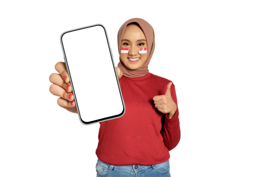Happy young Asian women celebrate Indonesian independence day on 17 August while holding smartphone with blank screen and gesturing thumbs up isolated on transparent background