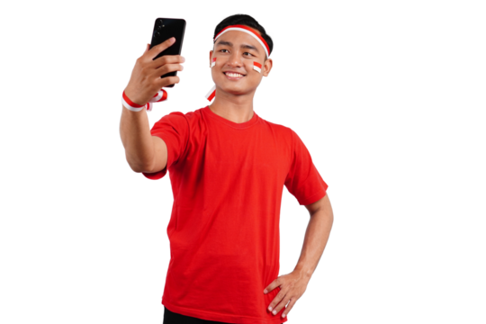 Young Asian men celebrate Indonesian independence day on 17 August with the Indonesian flag isolated on transparent background