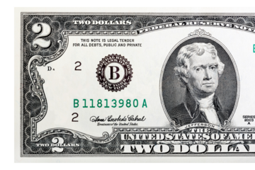 Large fragment of the Obverse side of 2 two dollars bill banknote series 1976 with the portrait of president Thomas Jefferson, old American money banknote, vintage retro, United States of America
