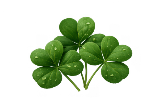 Three leaf clover leaves with dew drops representing luck, st patrick's day, and nature, isolated on transparent background