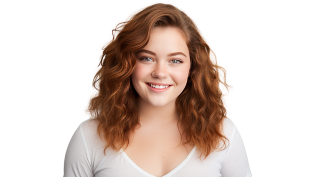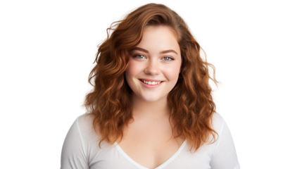Young chubby student woman, 18 years old, smiling at the camera, isolated on transparent and white background.PNG image.