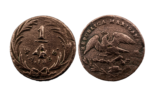 Reverso y Anverso de la Moneda 1/4 de Real 1833, Moneda Mexicana, águila devorando una serpiente