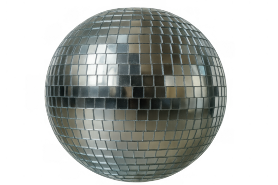 Silver disco ball reflecting light, symbolizing party, dance, music, celebration, and nightlife atmosphere on transparent background