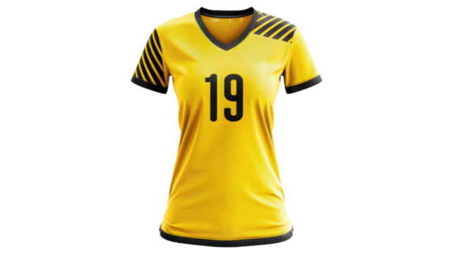 Yellow sports t-shirt with black stripes and number 19 on transparent background