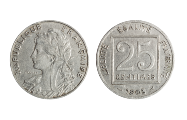 Isolated png photo of 25 French 1903 centimes nickel coin of Third Republic 1872-1941 on transparent background.