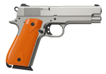 Isolated Colt M1911 pistol with an orange grip ready for commercial use in designs or advertisements