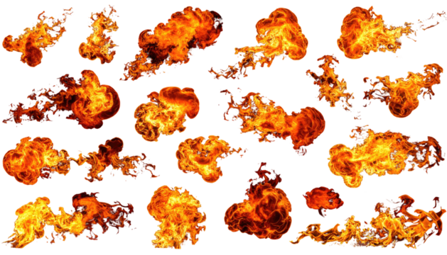 Diverse collection of twenty fluid, dynamic orange-red fire and smoke formations against a dark background