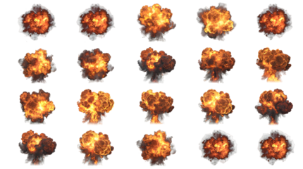 Massive professional collection of twenty cinematic fireball explosion sprites isolated on a transparent background for game development, motion graphics, action visual effects, and dynamic combat seq