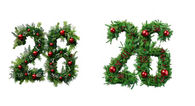 Festive christmas numbers twenty five and twenty six beautifully crafted from evergreen branches and red ornaments on transparent background