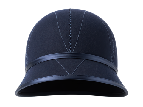 A navy blue cloche hat from the 1920s with subtle decorative stitching and satin trim, front-facing under studio lighting, isolated on a transparent background.