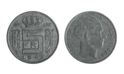 Isolated png photo of 5 belgium 1943 franc zinc coin of King Leopold the 3 on transparent background.