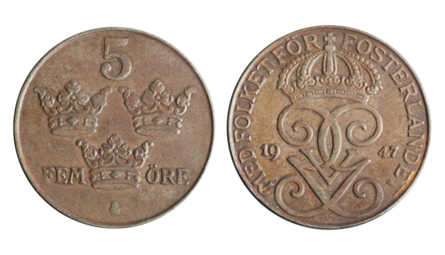Isolated png photo of 5 Sweden 1947 ore bronze coin of King Gustav 5th on transparent background.