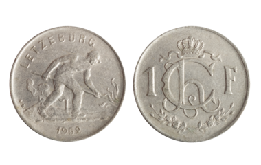 Isolated png photo of 1 Luxembourg 1952 franc copper-nickel coin of Grand Dutchess Charlotte 1918-1964 on transparent background.